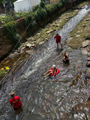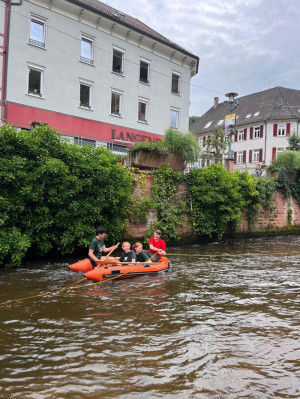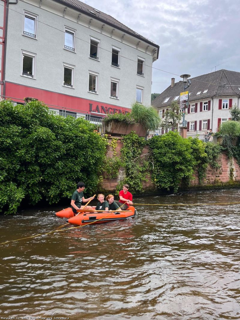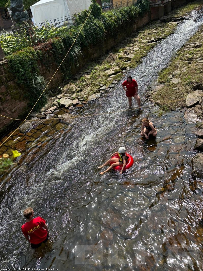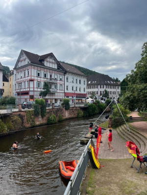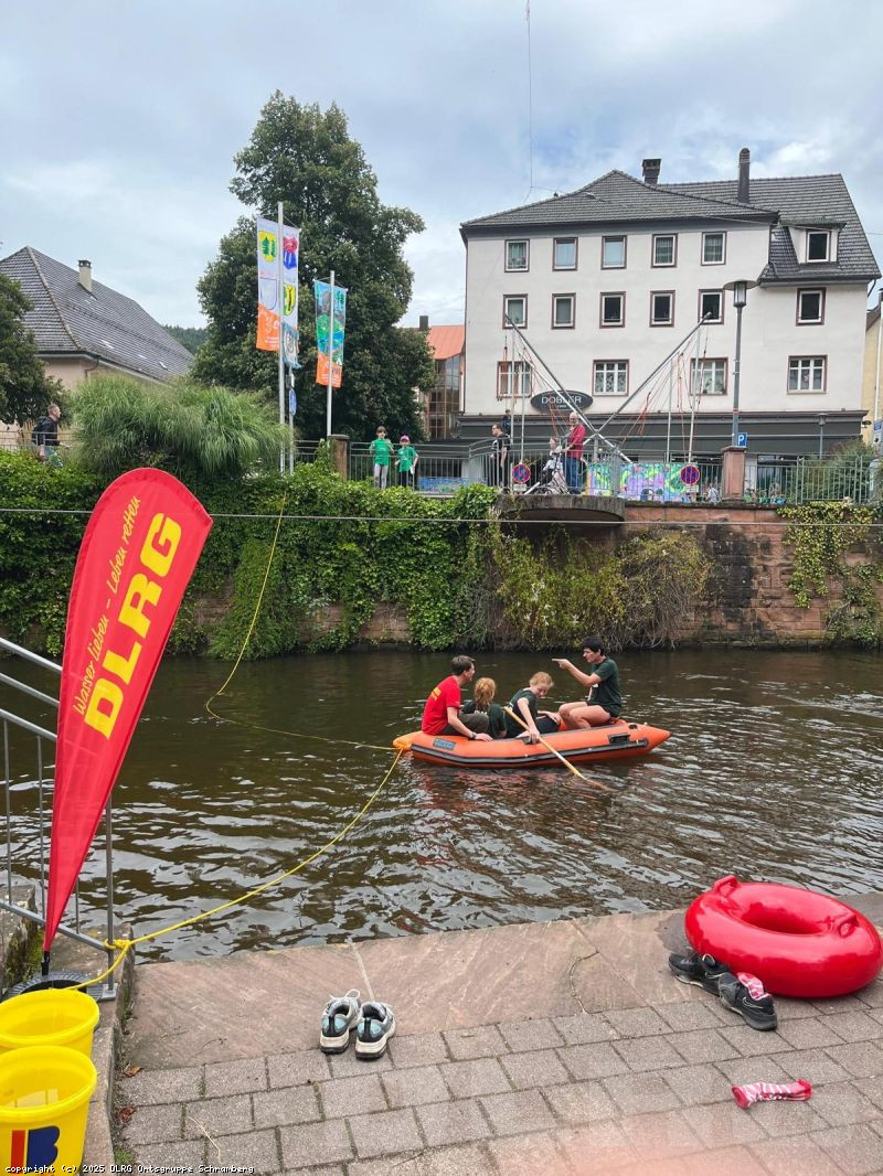 DieTeilnehmenden konnten unter unserer Aufsicht auf Wasserreifen die Schiltach entlangtreiben. Anfang der Woche wurde das Angebot aufgrund schlechten Wetters und hohen Wasserstandes noch spärlich genutzt (dafür hatten wir genug Zeit für ausgiebige Testfahrten) und unserkleines DLRG-Schlauchboot schien interessanter zu sein als die Wasserreifen.